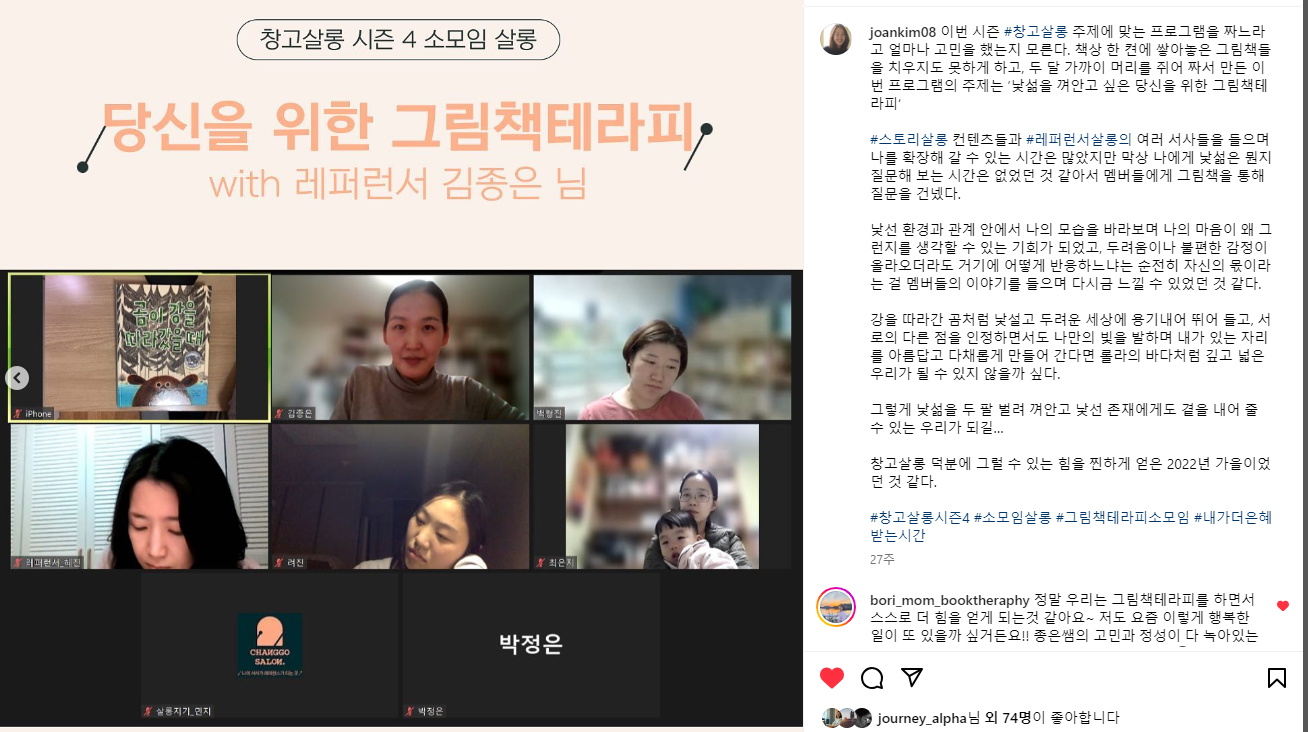 작년 육아휴직 중에 오랜 버킷리스트였던 그림책 테라피스트 양성 과정을 수료하고 창고살롱 시즌 3때 첫 소모임을 열게 되면서 큰 용기를 얻었고,지금까지 소소하게 활동하도 성장하고 있습니다. 창고살롱 시즌 1부터 백일 된 젖먹이 아이를 안고 그림책 살롱IN살롱에 참여했던 전적이 있을 만큼 그림책을 좋아하고, 그림책에 기대어 소소한 일상을 풀어내는 글을 쓰고 있습니다.