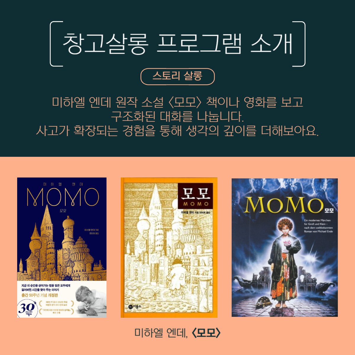 시즌7 스토리 살롱 주제는 ‘Redefine, 열망을 재정의하다’'입니다. 바쁜 일상에 늘 시간에 쫒기는 삶을 사는 우리는 효율과 성과에 매몰되어 진정 의미 있는 시간을 잃어가고 있지 않은가요? 1929년 독일 태생 작가 미하엘 엔데가 1970년대에 쓴 소설 <모모>를 함께 읽고 내 안의 모모 찾기를 해보지 않으시겠어요.
