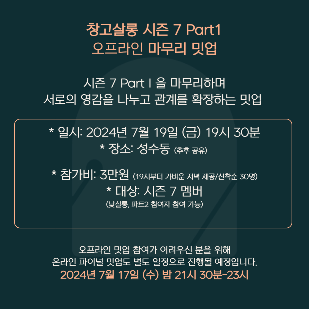 * 오프라인 마지막 밋업은 7월 19일 (금) 오후 19시 30분 성수동에서 진행되며 간단한 식사가 포함된 별도 참여 비용이 있습니다. 낮살롱에 참여하신 분도 선택 참여 가능합니다.