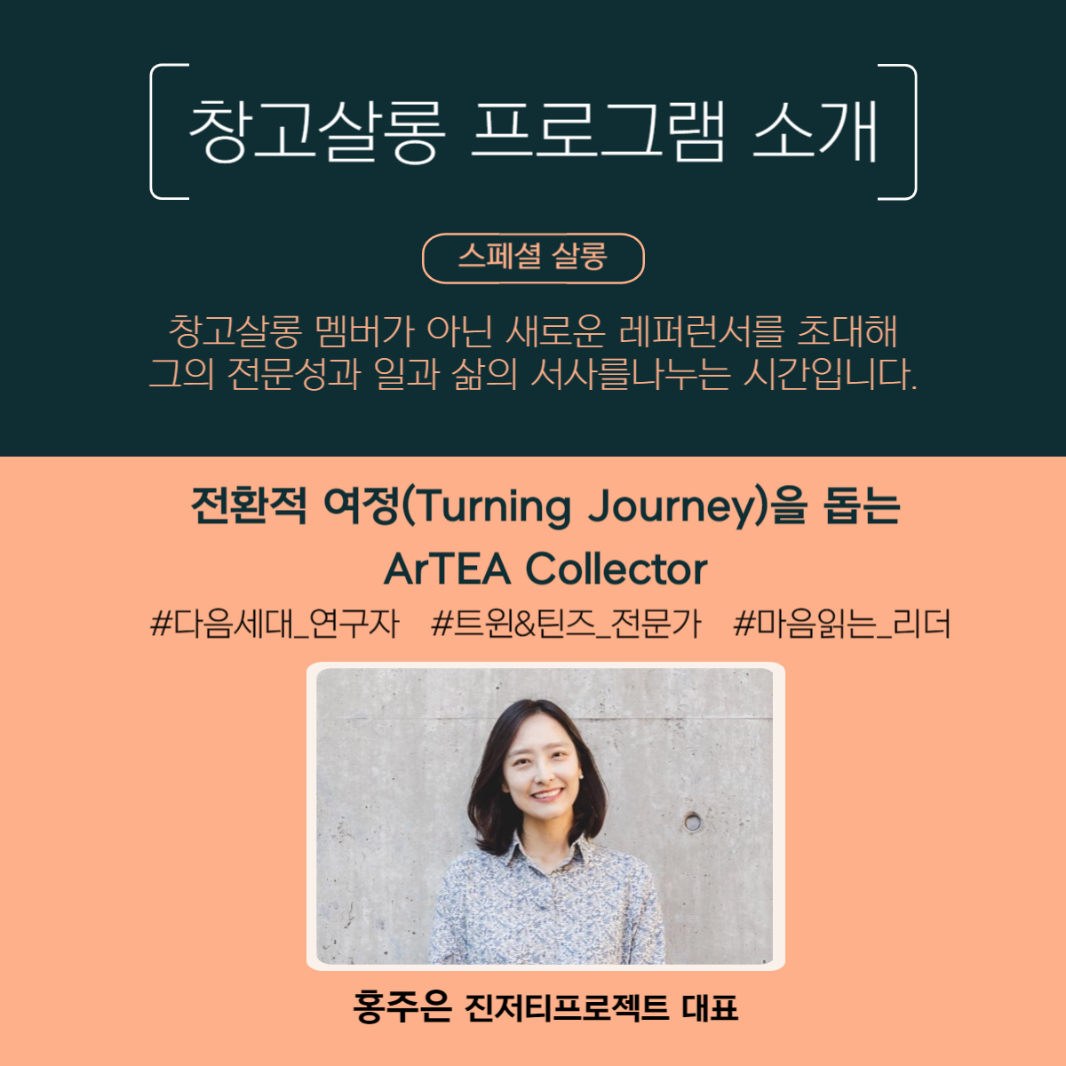 - 스페셜 살롱은, 멤버는 아니지만 창고살롱과 결이 잘 맞는 외부 연사를 초대해 시즌 주제와 어울리는 그의 스토리와 전문 영역의 이야기를 듣고 대화 나누는 세션입니다.