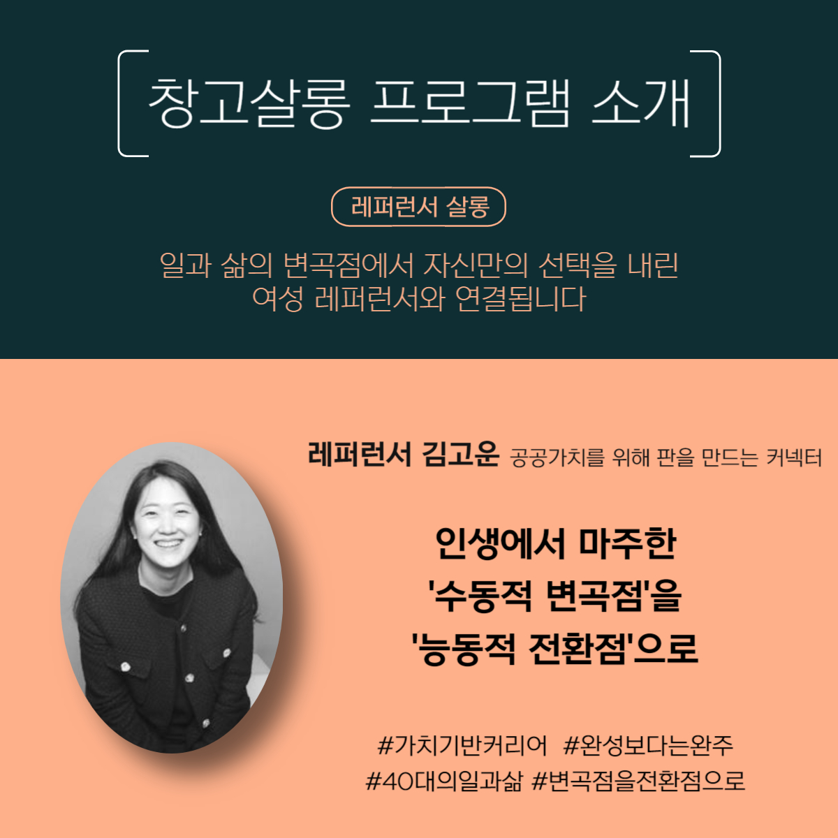 - 일과 삶의 변곡점에서 자신만의 선택을 내린 경험이 있는 여성 - 창고살롱의 레퍼런서(Reference+er)가 자신의 경험, 일과 삶의 고유한 서사를 나눕니다.