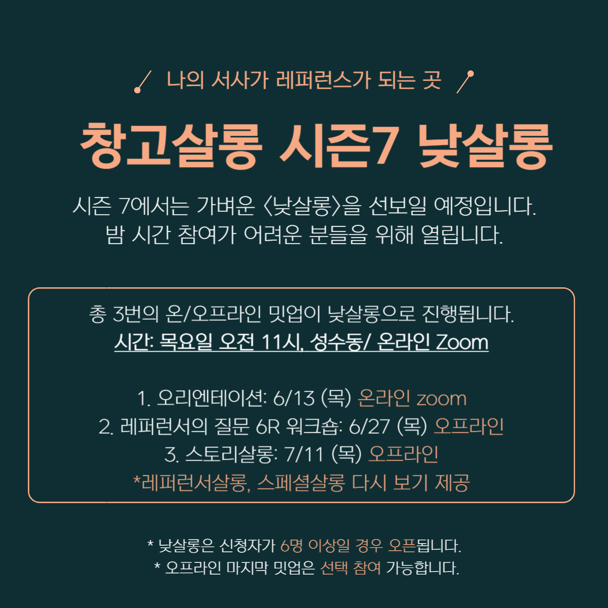* 시즌 7는 낮살롱은 저녁 시간대 참여가 어려운 분을 위해 가볍게 개설된 프로그램입니다.