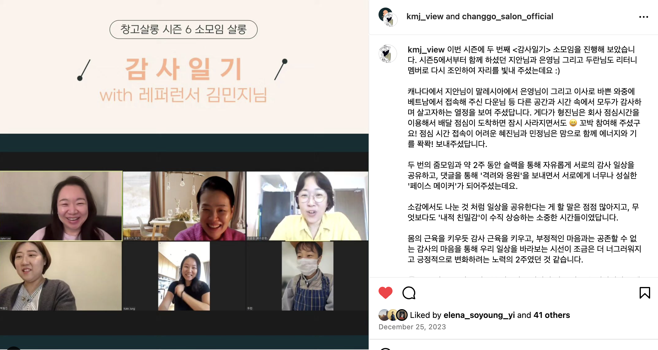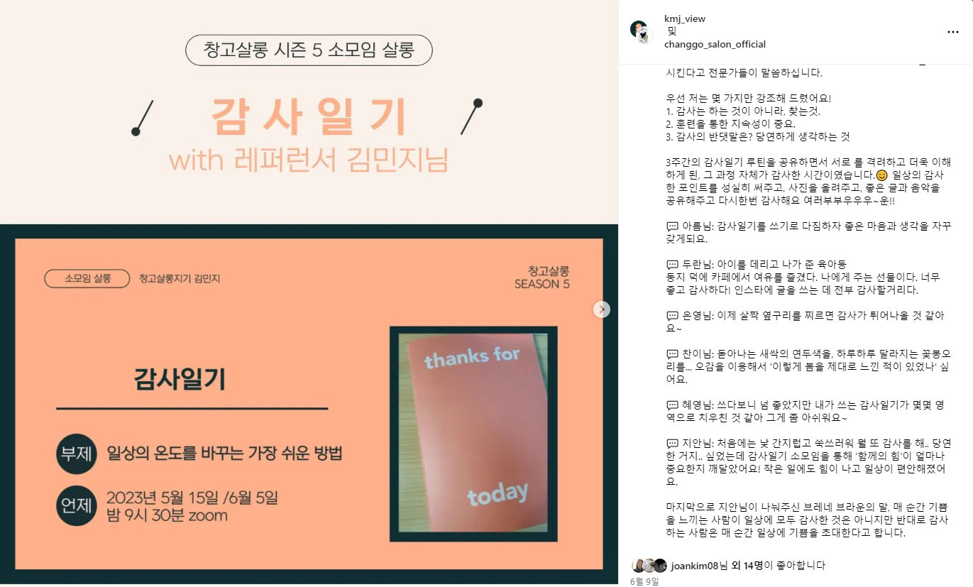 거두절미하고 말씀드리면 ^^ 제가 감사일기를 써보니 넘 좋아서 이번에도 열었습니다!!! 😍 그리고 이번시즌은 살롱지기로 여러분과 함께하지 못해 아쉽고, 보고픈 맘을 소모임으로 달래보고 싶은 사심도 있슴다! 하하
