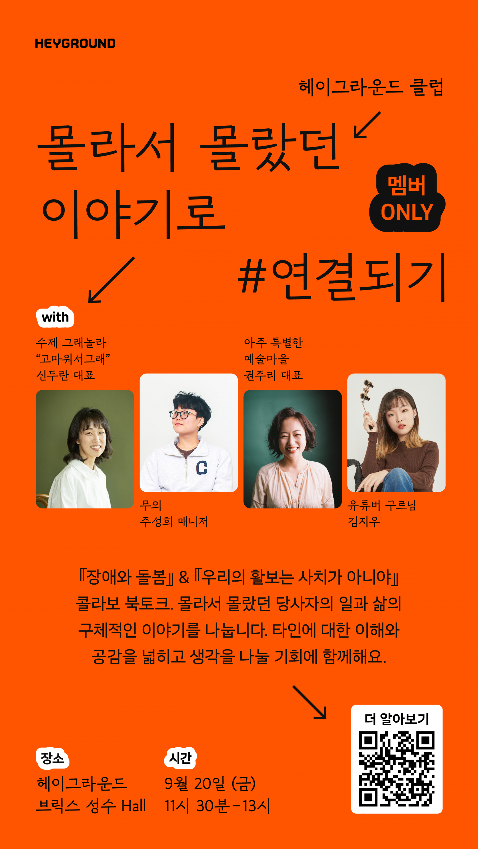 | 창고살롱 레퍼런서 권주리님이 기획&편집하고 레퍼런서 신두란님이 공저자로 참여한 책 <장애와 돌봄>에는 다양한 장애를 가진 당사자와 그들을 돌보는 이들의 삶에대한 이야기가 담겨있습니다. | 헤이그라운드 6~8월 작가전 전시 책 <우리의 활보는 사치가 아니야>는 유튜버 구르님으로 더 유명한 김지우 작가의 세 번째 책인데요. 10대부터 60대 구르는 언니들의 이야기를 담은 인터뷰집이에요. 무의(muui) 주성희님이 인터뷰이로 참여하셨고요. |