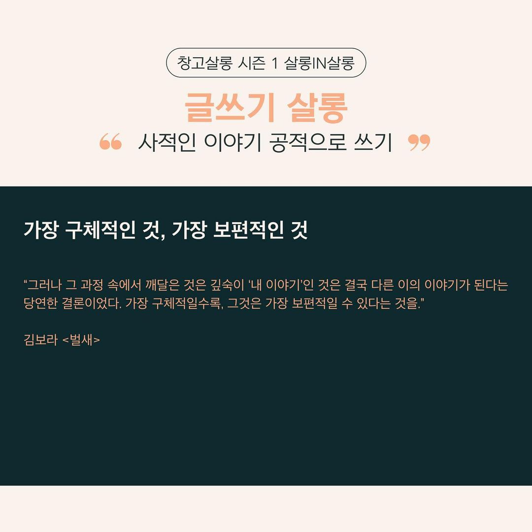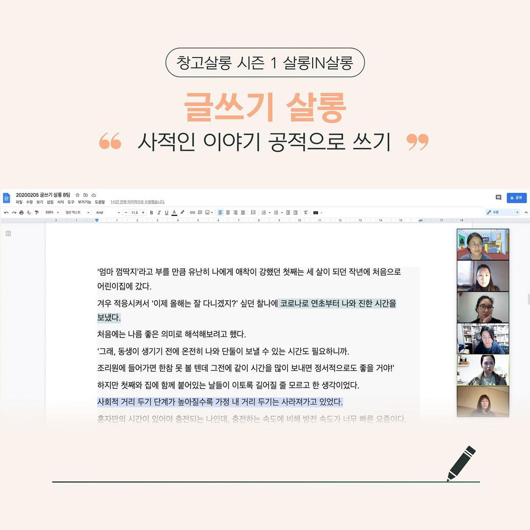 “현진님의 세심하면서 예리한 피드백이 빛나는 살롱이었어요. 완성되지 않은 글을 소리 내어 읽는다는 것이 굉장히 부끄러울 것 같았는데, 그래도 창고살롱만의 안전한 울타리 내에서 진행되어 재미있고 유익한 시간이었어요.”
