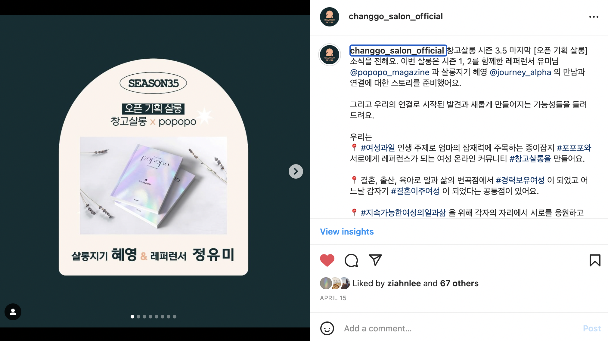 이번 시즌부터는 엄마의 잠재력에 주목하는 종이 잡지 포포포(popopo)와 창고살롱이 좋은 파트너로 스페셜살롱을 공동 기획 하였습니다.